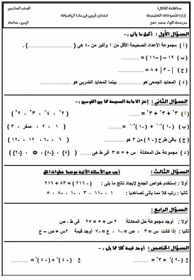 تحميل امتحانات الصف السادس الابتدائي النهائية الفصل الدراسي الثاني كل المواد امتحانات المحافظات