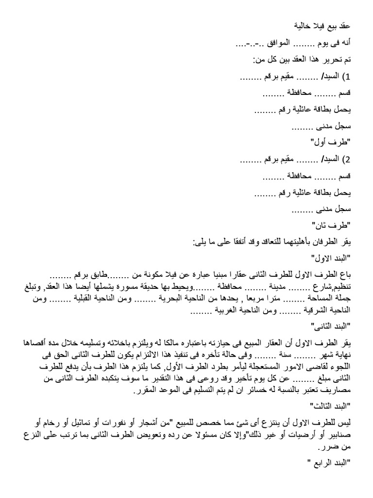 عقد بيع فيلا خالية