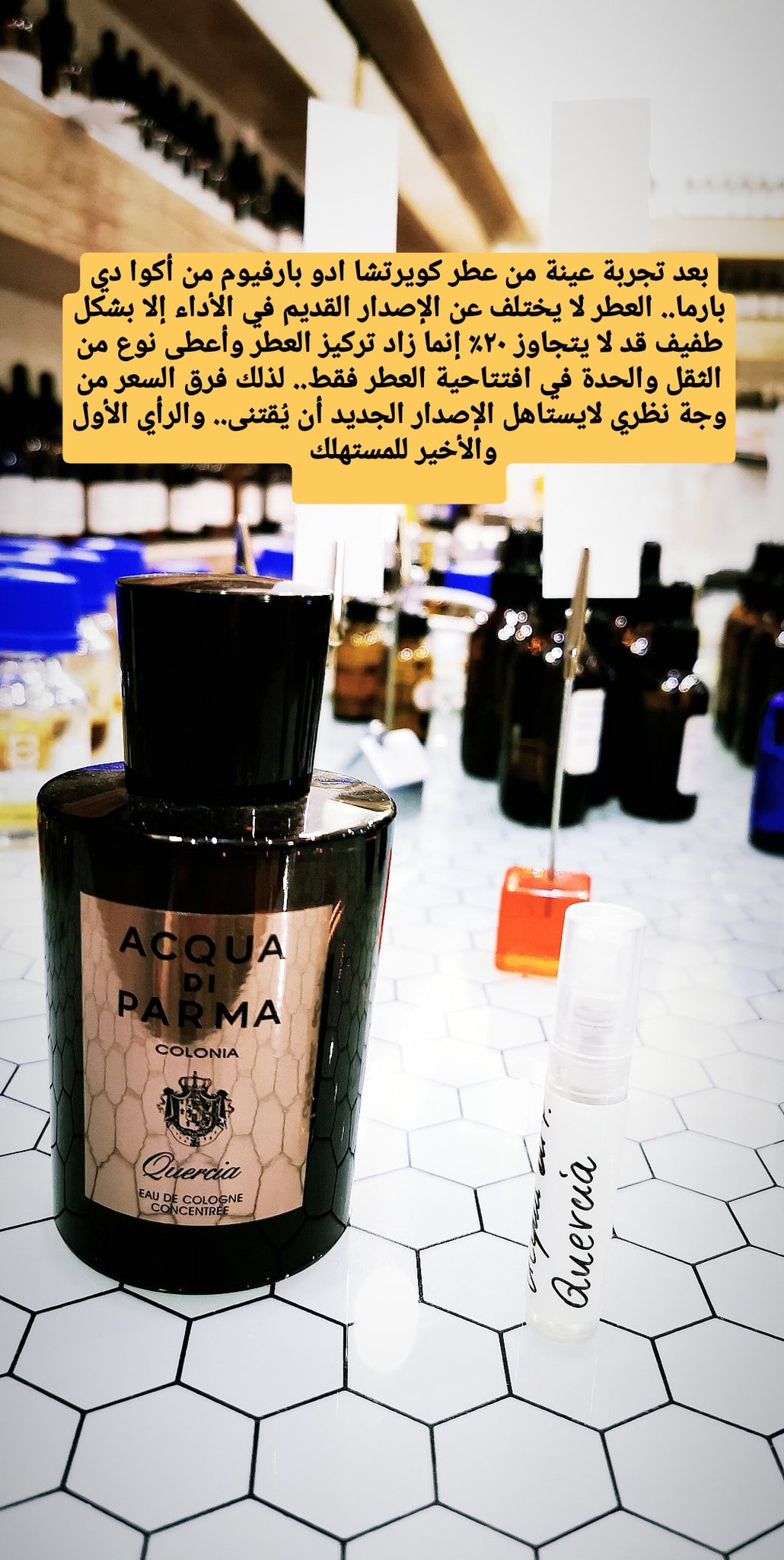 معلومات عطرية Twitterren بعد تجربة عينة من عطر كويرتشا ادو بارفيوم من أكوا دي بارما لا يختلف عن الإصدار القديم في الأداء إلا بشكل طفيف قد لا يتجاوز ٢٠ إنما زاد تركيز العطر